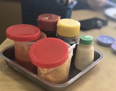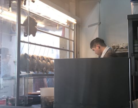 津津餐室之海南鸡饭 门口的莲 桌上的调料 食档上的竹夹 做料理的帅锅(发型) 图上挂着的鸡就说明白鸡和油鸡哪个更受欢迎