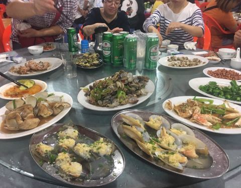同学推荐的海鲜大排档~价钱还算实惠的,味道烧的很好!蛏子好大个!九肚鱼鲜嫩!葱姜大蟹肥厚!唯一不足的就是小攋尿虾,感觉不太新鲜,后悔没吃跟小手臂一样长的大攋尿虾了…生意很好的,我们到店里的时候九点多,基本上座无虚席。那个空着的位子很快就被来人填满了…大蛏子!超赞!现在看了还口水直流!麻麻要求的荤素搭配…濑尿虾,品相不错,新鲜度不够…九肚鱼~肉质细嫩,好吃好吃,草鸡好吃啊!姜爆大蟹!鲜!