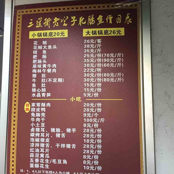 又是一家成都老字号的馆子,同事推荐来吃的,当几个人在大街上不知道晚饭吃什么的时候,其中一位推荐说那去吃三道街的肥肠鱼吧,立刻同行的几位吃过的同事表示赞同,那兴奋劲就像是仿佛已经看到了期盼已久的肥肠...又是一家成都老字号的馆子,同事推荐来吃的,当几个人在大街上不知道晚饭吃什么的时候,其中一位推荐说那去吃三道街的肥肠鱼吧,立刻同行的几位吃过的同事表示赞同,那兴奋劲就像是仿佛已经看到了期盼已久的肥肠鱼就在面前等待自己了。于是在下班高峰期6点堵车堵成狗的情况下还是毅然去了。先说说这家肥肠鱼的地址,在青羊区三道街41号,一环路上,几乎靠近市中心了,骡马市,八宝街,人民公园,长顺街离这里都很近,三道街是一个古老的小街道,可能没有肥肠鱼,自己都没有机会踏入这个古朴的老街道吧。进入三道街,没几步路就看到了肥肠鱼,主要是店门口人很多,很起眼。看到馆子的时候就有些震惊了,一是生意太好了,店门外的街道上都摆满了座位,二是馆子比较破旧,这里是典型的苍蝇馆子,一看就是确实开了很多年了,果真是老字号,名不虚传。店里的工作人员一直在不停的忙,要顾客自己上去给老板说几位,老板给安排位置,老板是单独给我们在门外新增了一张桌子。这里的肥肠和鱼是单独点的,鱼有三种,一种是花鲢鱼,26元一客,是按人头数算的,鱼头,38元一斤,吃过的同事说鱼头很好吃,钳鱼35元一斤。因为同行的人有9个,所以感觉吃自助的不划算,就点了钳鱼,一共6斤鱼,分成2锅,每个锅加了一斤肥肠。在等鱼的过程中还点了一些小吃,蛋酥花生:10元一份,蒜泥黄瓜:8元一份,毛豆角:8元一份,味道都还不错,特别是蛋酥花生,应该是自己油炸的花生、外面有一层蛋酥,吃起来脆脆的,大家边吃边聊天很热闹。推荐这里的家常酥肉,20元一份,现炸的酥肉,吃起来很香,基本上看到每桌都会有,不过酥肉一定是要现炸的才会好吃。肥肠鱼端上来很大一锅,里面很多配菜,这里推荐可以加一份午餐肉一起煮,很好吃。鱼和肥肠都很嫩,特别是肥肠,一定要加肥肠,很嫩,还有嵌鱼,味道很不错,很入味,没有一点鱼腥味。不过这次吃的嵌鱼感觉有点肥了。里面还有各种配菜土豆,藕,宽粉,花菜,总之很大一锅。总体来说,吃下来味道很不错,不过有几点需要注意:首先最好先电话预定一下,要不然来了会等很久,这家店的生意真的很好,所以也要尽量早来,要不然后面很多菜就没有了。然后就是这里的花莲是按人头来算的,不是按斤来算的。还有就是我们9个人点了6斤鱼,2斤肥肠,还有一些小吃,最后都没有吃完,本来鱼里面也会加很多配菜,所以点菜的时候要注意,不要点多了浪费。最后就是这家肥肠鱼确实味道不错,值得推荐。