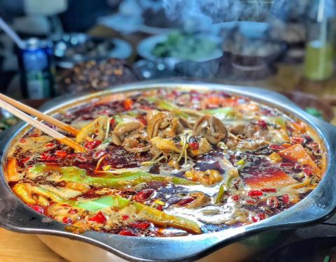 - 肥肠鱼端上来很大一锅,里面很多配菜,这里推荐可以加一份午餐肉一起煮,很好吃实用