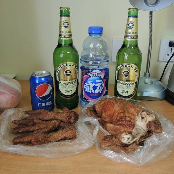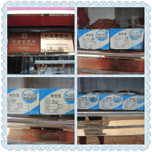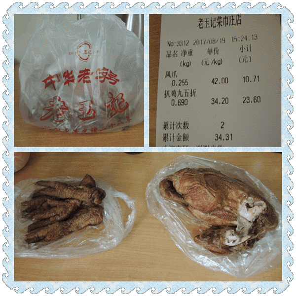 从南门出来是有缘故的,因为这里距离我们晚餐的出处很近。今天的晚餐是回酒店吃“室内野餐”,主菜就是德州扒鸡!在网上查到点赞最多的是一家名为“老玉记扒鸡”的店铺。昨晚在网上一通搜索, 发现大明湖南门附近的这家和我们的游览路线最相匹配,于是就决定在这里购买了。这家“老玉记扒鸡”其实很好找,就在南门的马路斜对面,步行200米左右就到了,门口的招牌很明显。可我们找寻时却受到电子地图的迷惑,颇费了一番周折。地图显示“老玉记扒鸡”位于“菜市新村街”里的一个居民楼里,我们很容易就找到了“菜市新村街”,进到街里找了好几栋楼也没有发现。于是就问一位在街里巡逻的保安,他居然说没有听说过“老玉记扒鸡”。幸亏喵喵机灵,回到街口四下张望,一下就看到了位于街口第一家的“老玉记扒鸡”店。看来这电子地图是应该更新了,而那位巡逻的保安也应该更新了。试想,连你防区内的情况都搞不清楚,此地之安如何得保?我要是此小区的居民,就要赶紧搬家喽。位于“菜市新村街”街口的“老玉记扒鸡”。这是一家始创于清光绪二十八年的老字号,现在拥有两块老字号牌匾呢。经营的品种不少,价签儿都贴在橱窗上,明明白白。我们买了一只扒鸡,紫檀一看放在电子秤上的那只鸡,发现没有鸡爪子,心里有些不爽:就是想吃一只完整的扒鸡, 怎么这些扒鸡都是缺胳膊短腿的呀?于是就决定为它补齐了,玩心突起,要了四只鸡爪子。这倒好,不仅给扒鸡补齐了腿儿,还让它变成了四条腿儿的“战斗机”。 开个玩笑啦,买鸡腿的真实原因是,橱窗里的鸡翅、鸡腿儿、鸡胗、凤爪等卤货里,最入我们“法眼”的就属这凤爪了,外观油润,色泽红亮,皮肉蓬松,一副特别软烂的样子,所以就忍不住先来四只尝尝味儿啦。另外,也是为了和昨天吃的“高家扒鸡”的凤爪比一比,看看哪家的更好吃。买完扒鸡,我们坐公交车回酒店。下车站就在家乐福门口,现上超市买点饮料、啤酒去。我们买了好几种饮料,啤酒就只要了“黑趵”,“崂山”还是算了吧,换成喵喵喜欢的“青岛”了。本来想买点“青州蜜”(一种产自青州的小绿桃子,甘甜可口),前年在青岛吃得很得味,没想到济南的超市和街头都没有,只好随便买了几个桃子,价格倒是不贵,可是味道也就一般般啦。我们的今晚的“室内野餐”,还挺丰富吧。扒鸡个头适中,外观油润,闻之气味喷鼻香,很是引人食欲。以手撕而食之(恕我们没有合适的餐具),味道鲜美,肉质细腻,酥软绵烂,实在是可口呀。由于这是现做现吃的几乎是热乎扒鸡,比之以前购买的密封袋扒鸡味道要好很多,至少没有“密封扒鸡”那么齁咸齁咸的。没有了那让人生厌的死咸的味道,鸡肉固有的鲜美滋味就淋漓尽致地体现出来了。看来到山东吃一次现做现吃的热乎扒鸡才能打消以往对扒鸡的偏见呀。由此看来,以后每到一地都品尝一下当地现做现吃的名优美食,一定会为很多佳肴起到正名的作用的。老玉记的凤爪是21元一斤,比“高家扒鸡”的凤爪便宜两块五。凤爪的味道也很鲜美,皮松骨软,滋味浓厚,很是美味。但和“高家扒鸡”的凤爪比起来似乎稍微差了一点点,好像是卤汁的醇厚程度欠了一些。但是在讲,两者相差无几,都很好吃。 两家扒鸡店的凤爪稍有差距,我们推断他们的扒鸡也应该有相应的小区别。考虑到两家店铺地理位置的不同,以及我们明天去火车站时间的关系,看来我们只能在酒店旁边的“高家扒鸡”购买带回北京的手信了。对了,还有一点就是“高家扒鸡”有真空包装,而老玉记的没有,恐怕不太容易保证食物的质量了。