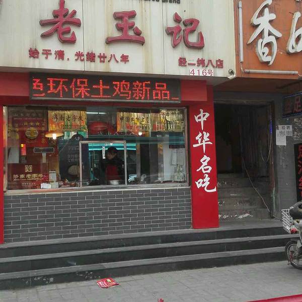 中华传统名吃!主要是扒鸡等食品。老字号啦, 老玉记扒鸡店原名为玉记扒鸡店,1962年为了恢复传统名吃,遂将玉记扒鸡店改为老玉记扒鸡店。是由经理张润生之祖父张诚创办的。 大名鼎鼎的老玉记扒鸡、马家牛肉是济南的名小吃。果然不是盖的,名不虚传。这家是个门头,脸儿不大,就一个窗口对外,但扒鸡、凤爪、鸡胗、扒蹄……一样不落,一上货,老远地飘香。扒鸡、凤爪自不必说,色香味没得挑。特爱吃这里的趴蹄,软、糥、香、烂、肥而不腻,久久留香……推荐!真的挺好!