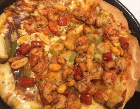 小龙虾披萨的小龙虾特别多,味道比较好,二人餐套餐很划算,我们两个人都没有吃完。