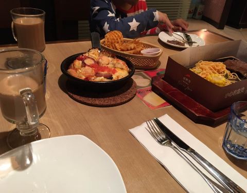 点的海鲜披萨和牛排,因为人多上餐有些晚,美女店长送了饮品和小吃,谢谢了,孩子很喜欢。很愉快的一次用餐经历,会经常光顾。