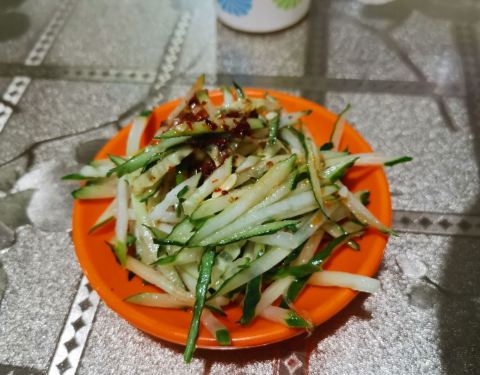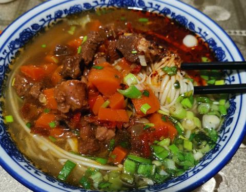 去完沙漠回来都晚上9点40分了,这家店还有不少本地人在吃面,点了红烧牛肉面,牛肉是挺多,但是肉有点老,我的口味本身有些重,但是这汤底更加咸,所以一口汤都没喝,服务员每位客人都送了一盘黄瓜丝可能知道汤底...