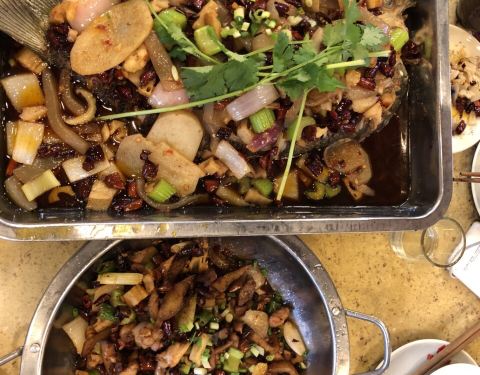 听说这里的香辣烤鱼是特色,特地不远万里来吃~~还是很满足!!烤鱼慢慢入味,能吃到不同的层次感,简直是渐入佳境!!越来越入味!!!鱼肉鲜嫩,鱼刺适中~~「煮花生」这个好吃!!配合老荫茶,特别有感觉!!烤鱼小火慢煮,和朋友边刨花生边等,有意思