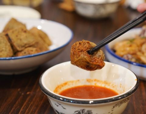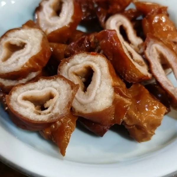 - 口感和调味上都不尽人意不推荐。个人认为不蘸酱都足够入味。好喜欢吃大肠,但是第一次遇见这种薄薄一层外脆