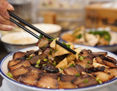- ...很有过年气氛的一道菜,底下的素鸡看起来朴素,但其实特别入味,铺满满的冬笋腊肉,咸鲜味都渗了进去