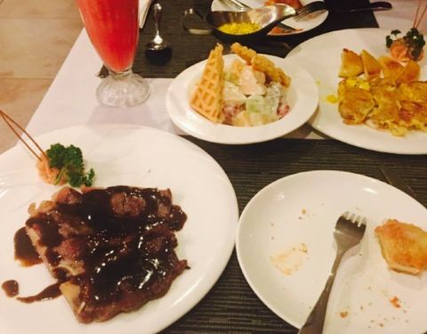 七夕的晚上来的,因为过节嘛,来的人十分多,等了一个小时还是有好多人,就让我们去了中餐厅那边,一个月内第二次吃这个套餐了,或许是因为过节的缘故,土豆泥换成了沙拉,只是我感觉比沙拉好吃。这次牛排里面没有意大利面了,服务也不如上次好了,但还是一如既往的支持??。