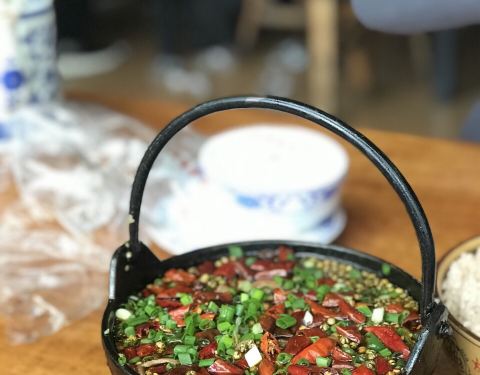 网红店:茶泡饭 传说中某著名导演来吃过哦 再半山腰的小饭馆,装修很简朴,入门就有一个小庭院,有八张小桌子~去的那天坐满了人儿! 如果天气好的话,可以远处俯视嘉陵江,是个不错滴视角!还可以看着底下轻轨的轨迹 茶泡饭推荐前三的菜品,果然群众对美食的口味是一致的! 分量很大,吃不完,但是呢真的好吃😋