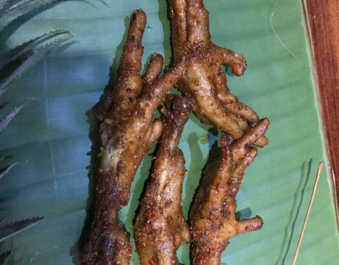 赠送的百香果汁有神秘感有特色好喝,特色芭蕉叶放置菜品,鸡爪、小串、烤面包片每次必点,见图荤素搭...