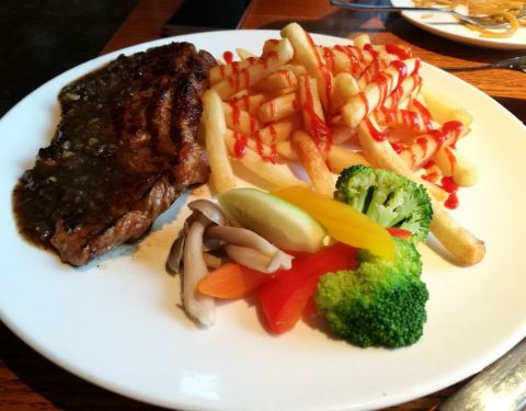 点了奶油蘑菇汤、澳洲西冷牛排、炒意面、凯撒沙拉,味道中规中矩,没有什么出彩的特色,总共188元