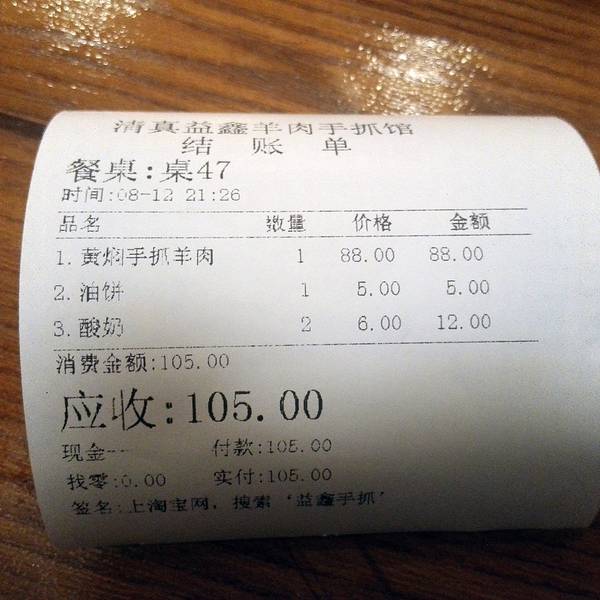 这家店点菜方式不太一样。 如果同行有两人以上的话,可以只留一个人排队,其他人进店找位置坐着。 排队的人排到之后,点菜,领取号牌。然后接着排队...等着领菜... 拿到菜之后就可以一起吃吃吃了~ 如果只有一个人的话...只能老老实实排队点餐取菜,然后在店里找位置了。排了很久很久很久...终于拿到了号牌...先上楼占了个位置,熬茶和蘸料都上了好久了...菜却还没来...一斤羊肉并没有很多,两个人很快就吃完了。 味道确实不错,几乎没有羊肉的膻味,肉的香味却还在。油饼就一般般了...感觉太干了点...酸奶确实好喝,不用撒白糖,直接一勺勺舀着吃就已经很棒了。吃饱喝足,离开益鑫,漫步在西宁街头。