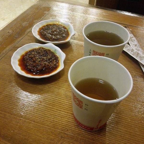 如果只有一个人的话...只能老老实实排队点餐取菜,然后在店里找位置了。排了很久很久很久...终于拿到了号牌...先上楼占了个位置,熬茶和蘸料都上了好久了...菜却还没来...一斤羊肉并没有很多,两个人很快就吃完了。