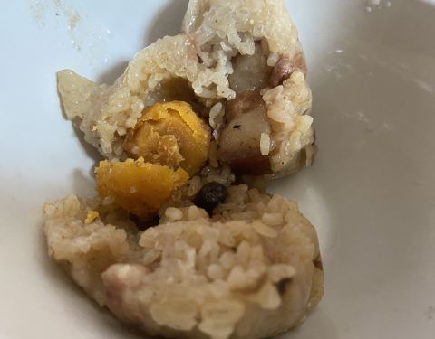 - 程班长台湾美食的粽子需要提前预定,30块钱一颗,里面有整颗的咸蛋黄、香菇、一块五花肉,典型的台湾粽子