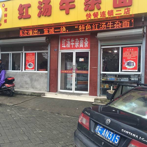 邓师傅牛肉馆位于文房四宝之乡——安徽宣城,具体位置是宣州区鳌峰西路与陵西路交叉口,市区做9路公交车在电信公司站下车即到,开车的朋友停车也非常方便,门口停车场比较大,且有专人看护,比较安全。 邓师傅牛肉馆的营业时间是早上六点至晚上八点,顾名思义,邓师傅牛肉馆主要以牛肉牛杂方面的美食为主,这点从门头和名称即可看出。里面有红汤牛杂面,牛肉面,青椒牛肉面,洋葱牛肉面等,除了这些,常规面馆应有的如雪菜肉丝面、青椒肉丝面等等一应俱全,各种口味盖浇饭、炒饭均有。余外还免费供应各类小菜,品种多样,比如咸豆角、毛豆米、腌制萝卜丝、咸菜等。老板为照顾部分客人喜欢吃香菜和蒜泥,也专门配备,根据自己的用量自取,非常方便。价格方面也适中,比如牛肉面单价15元,蛋炒饭单价7元,符合大众消费。 个人认为如果能有wifi的话,就非常值得称赞了。