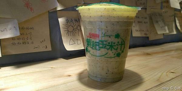 黄记玉米汁店面不大,但布置很精致,很温馨。特别是还有面留言墙,可以给每一位食客贴上自己写下的祝福。招牌玉米汁是店里主推的,用新鲜的精选玉米磨成。喝起来有一种玉米的清香,清甜的味道喝着感觉很舒服。
