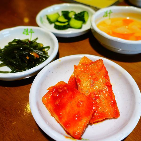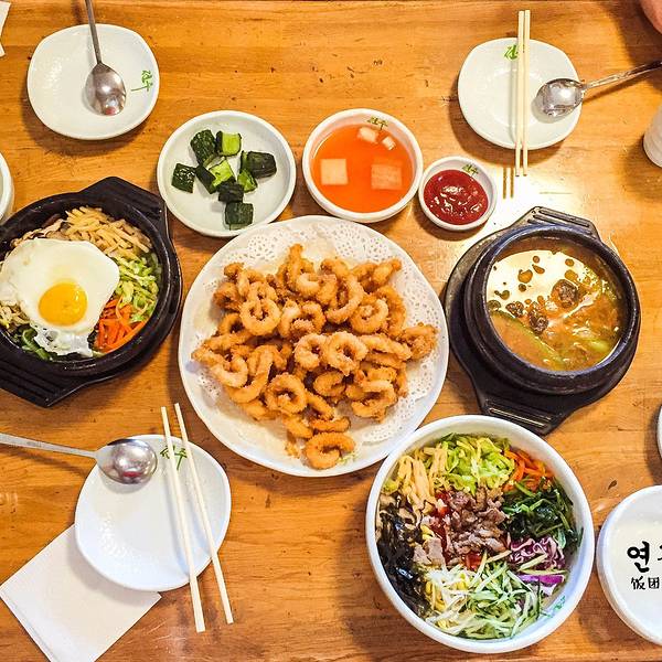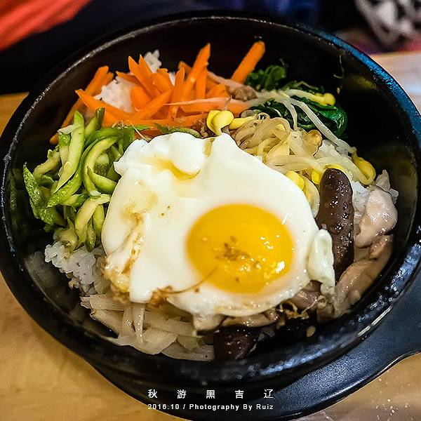 在图们搜索美食,找到这家排名第二的“全州拌饭馆”,一进门就感觉是一家典型的朝族人饭馆,一半榻榻米的桌椅,餐厅开阔,坐得舒适,点了招牌“|全州拌饭^”,“|锅包肉^”,还有“|好烧明太鱼^”。“锅包肉”外脆里嫩,酸酸甜甜,很是开胃,“明太鱼”口感结实,好像是海鱼的一种,“|全州拌饭^”就是石锅拌饭,滚烫的石锅碗里,米饭、红萝卜丝、黄瓜丝、白菜丝、豆芽、蘑菇、少许肉沫、一只嫩鸡蛋,搅拌均匀,即可食用,比较独特的风味。总体感觉,味道不错,份量很足,满足满意~
