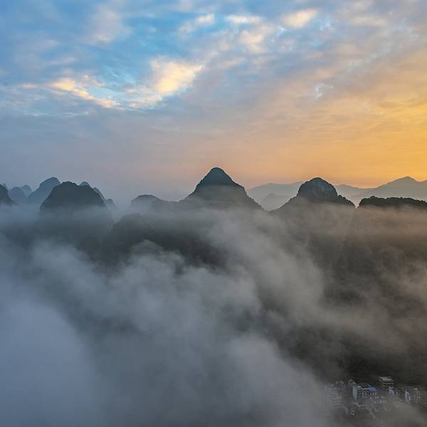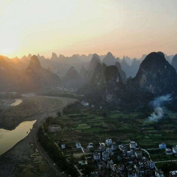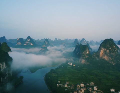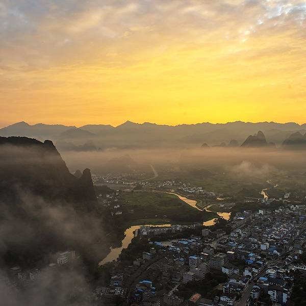 来自游记老寨山上的水墨画,九马画山的黄布倒影,遇龙河上的炊烟袅袅