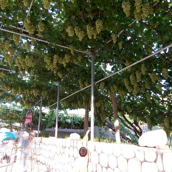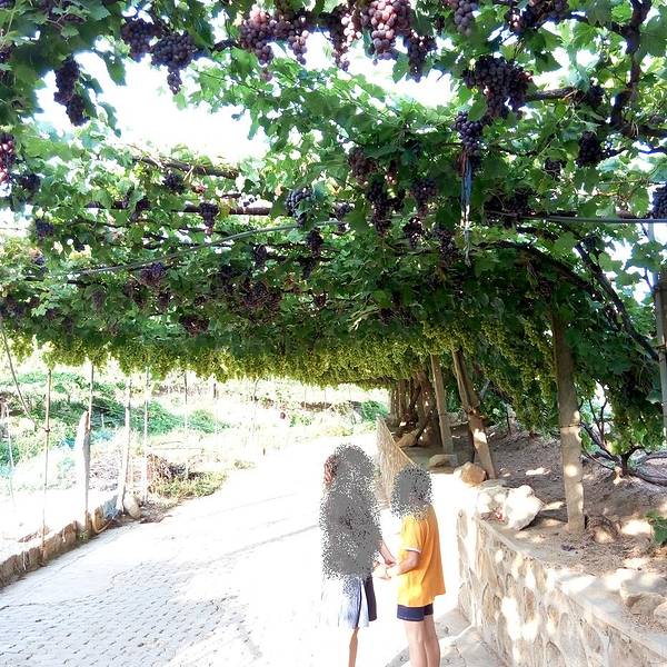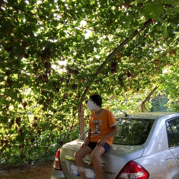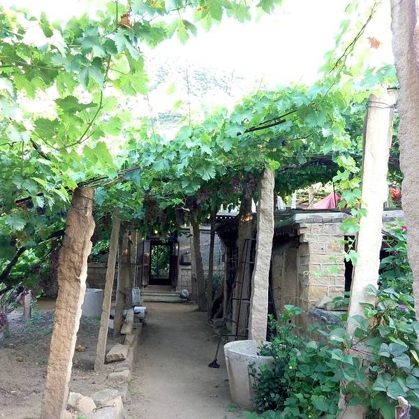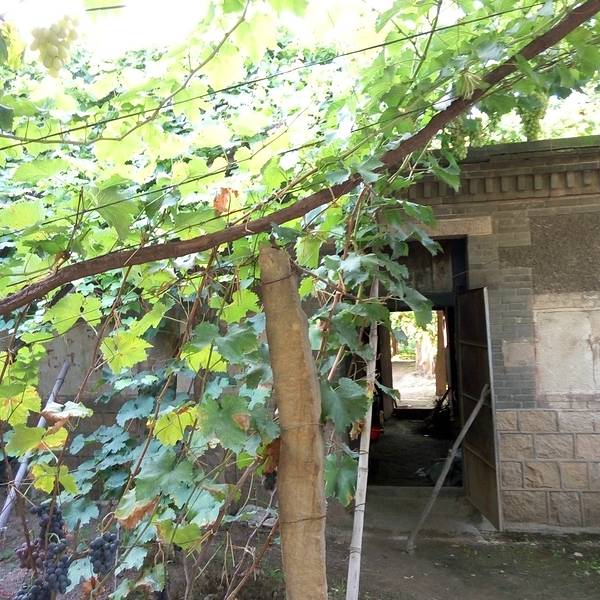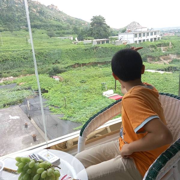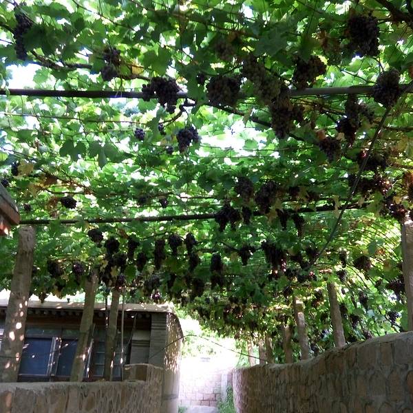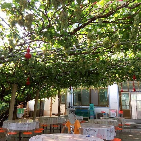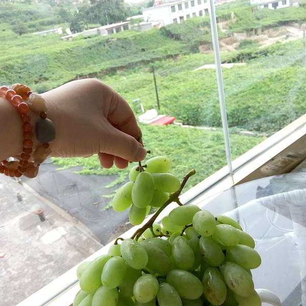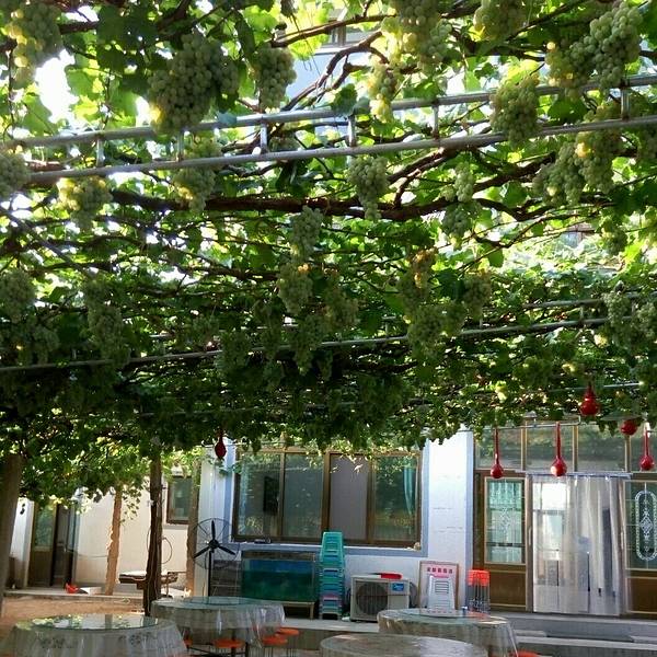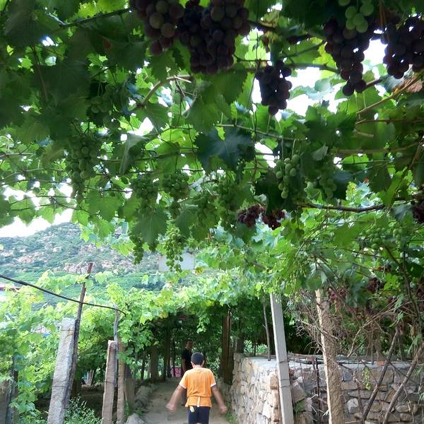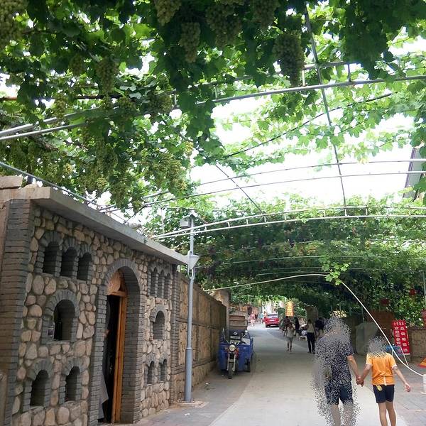 农家乐的主人在接着我们,但是进景区都必须要买票的,好像是20元/人吧。也是可以理解的,毕竟在山沟里除了葡萄,土地很少,农民没有别的收入的。基本每家每户都是种葡萄的,穿过一片片梦幻般的葡萄架,就到了预定的农家乐,门口葡萄架下可以停车,而且打扫的很干净。到农家乐看好房间放好行李安顿好,店主先给剪了串葡萄尝尝。房间在三楼,从窗户向外看,漫天遍野的,全是葡萄呀!马奶子葡萄,洗下就能吃。连房顶上都铺满了葡萄藤。