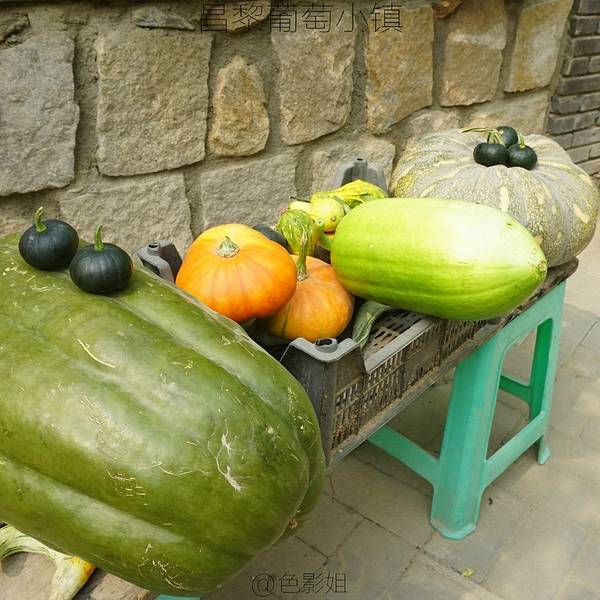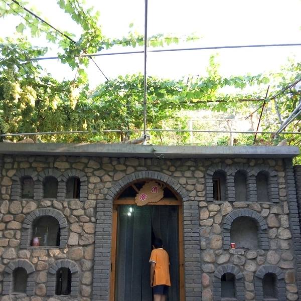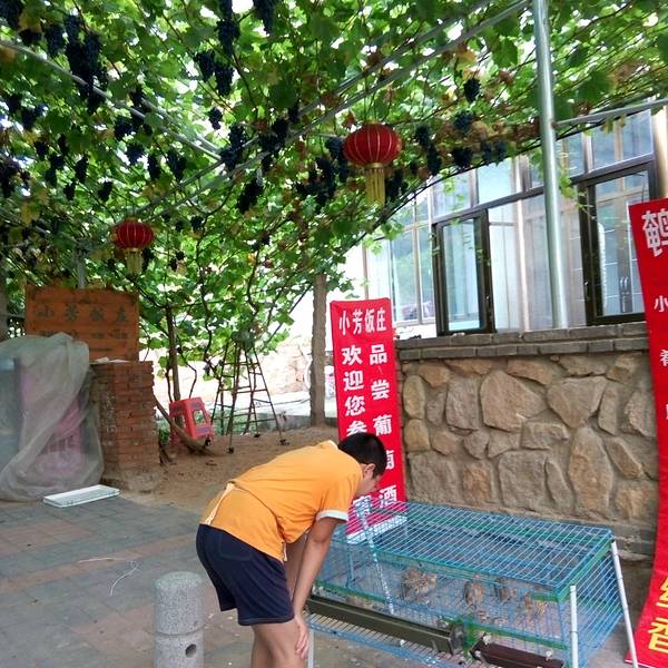 房间里稍微休息下,赶紧出去转转了。因为是周末的傍晚了,外面人不是很多了,听说周末来度假的人特多。来的时候路上那个堵车,俺们也见识了。还有各种野味,小鹌鹑啥的,不知道是否山上逮的呢?铺天盖地的葡萄啊,让人看着那个兴奋啊!但是看归看,千万不要随便采摘哦。每户农家乐店家都有葡萄和葡萄酒卖的,都有自己的酒窖。玫瑰香一般是5元/斤,美人指的大约10元/斤,品种不同价格各异。葡萄酒是50元/瓶,好象不是1斤的。街上到处都是卖塑料桶装的葡萄酒的,虽然价格便宜,还真不敢随便买呢。每家老房子里,都会有好大棵的葡萄,不是藤了呢,都长成葡萄树了。美人指葡萄,看着那么的诱人,要到9月底才成熟,味道、口感都更好。