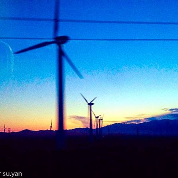 - 晚上九点到柳园车站,这天还这么亮。继续来张夕阳下的大风车吧