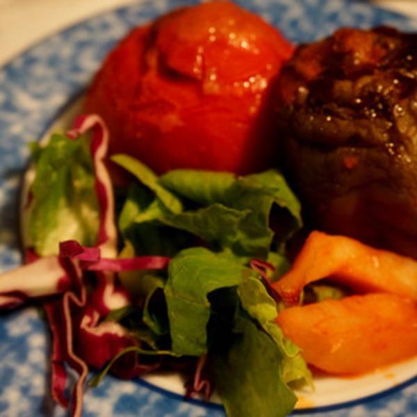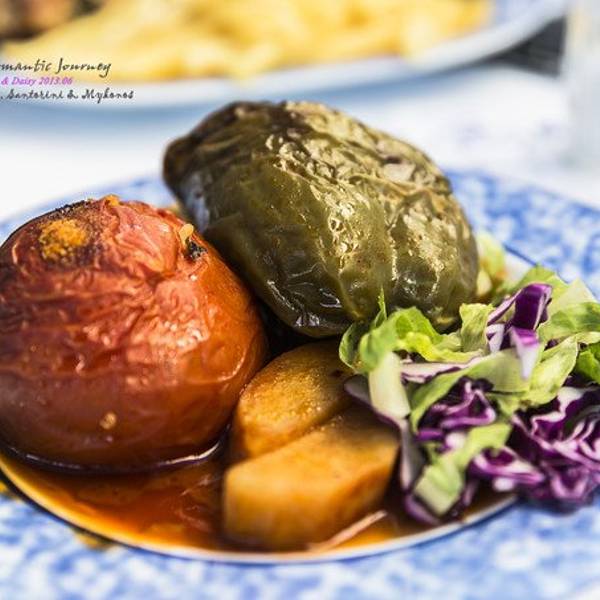 晚餐在伊亚小镇最出名的八爪鱼餐厅就餐前菜是某豆类制品,类似我们国内的绿豆馅,清淡爽口招牌当然就是这可爱的八爪鱼主菜餐厅傍海建在悬崖边上,边吃晚饭边看着日落,也是人生一大乐事。岛上最出名的小吃,用茄...