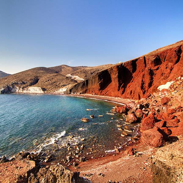 从费拉可以乘坐公汽到达红沙滩(kokki...圣托里尼有3个很有名的沙滩,黑沙滩、白沙滩和红沙滩。顾名思义,红沙滩就是指这里的沙子是红色的,从海上老远就可以看见这个沙滩,因为它的颜色和周围的区域是那么不一样。