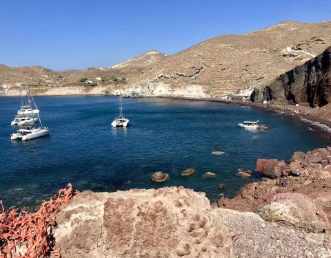 从费拉可以乘坐公汽到达红沙滩(kokkini Beach)乘坐公汽到达Akrotiri站,然后步行一段距离就可以到达红沙滩,票价为2欧。