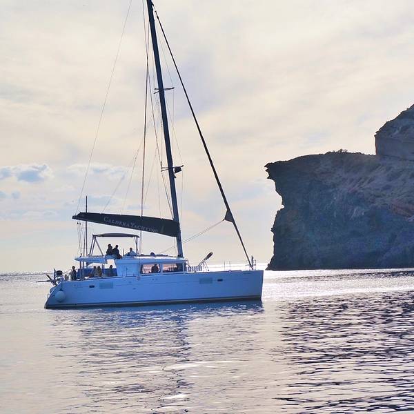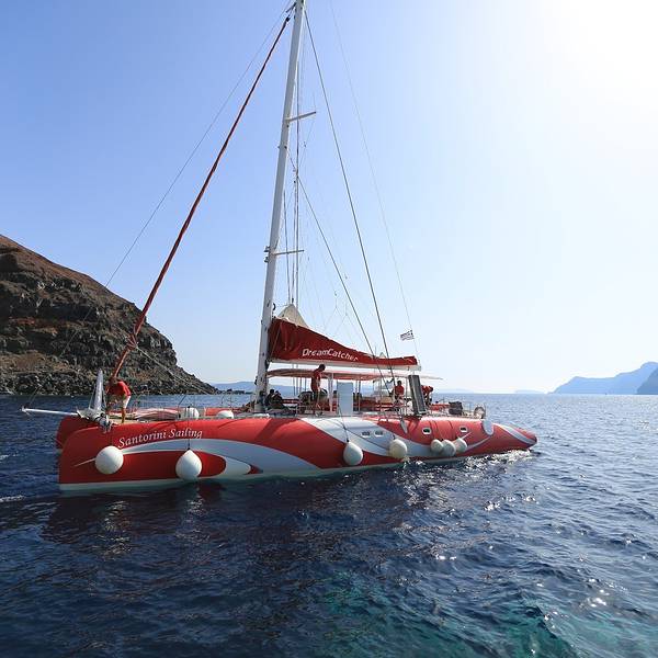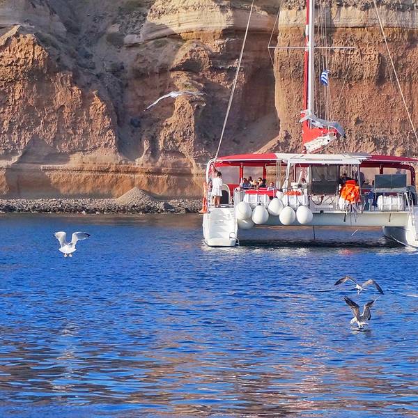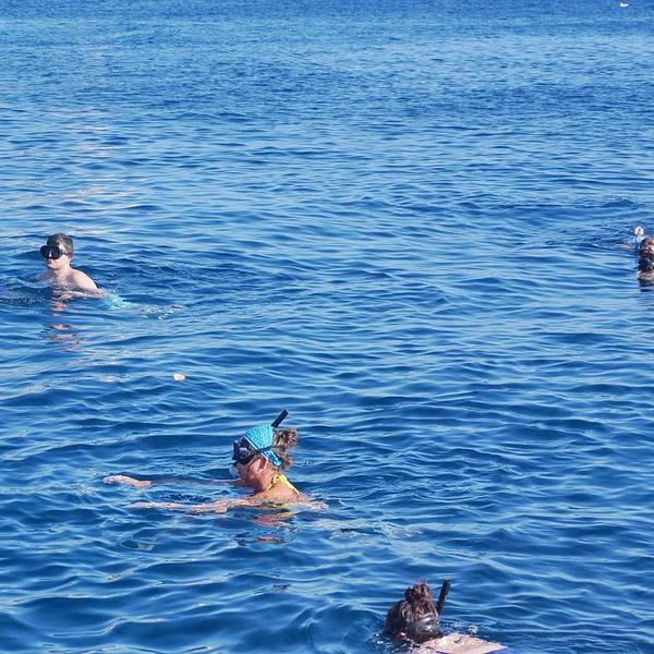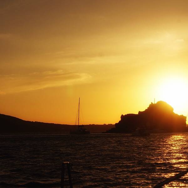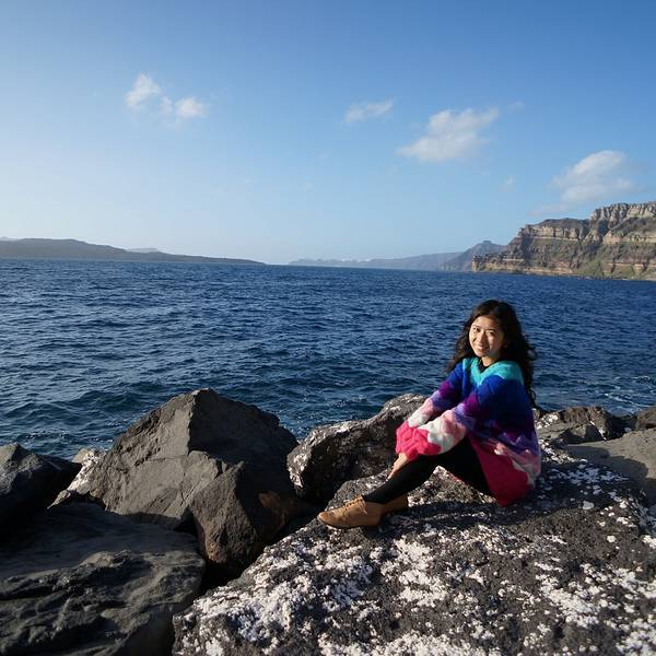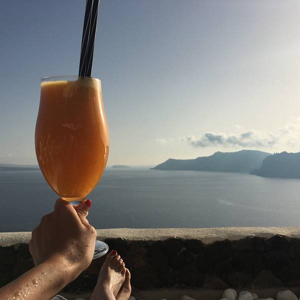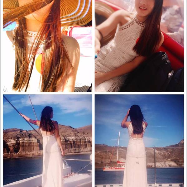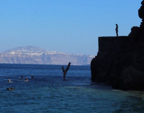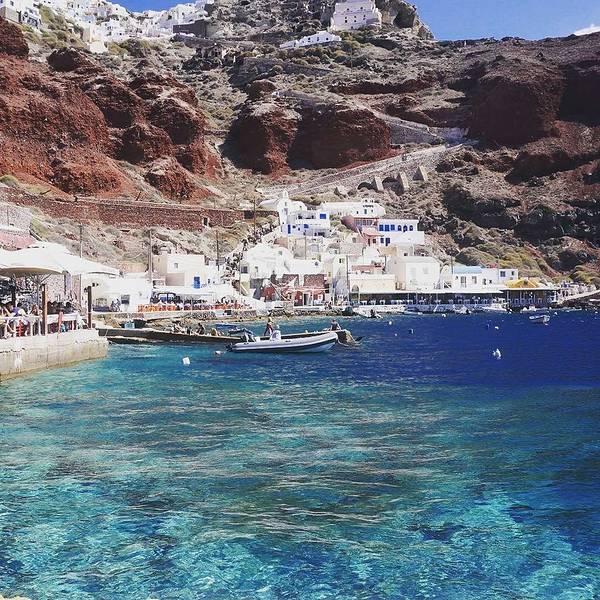尽管是码头,然而水却清澈得好像透明的玻璃海一样。临海摆上小桌椅,来上几盘最新鲜的海鲜,脚下是碧海抚岸,游船进进出出。这小港里的氛围,不似山顶上那些精致得好像不食人间烟火的悬崖酒店,在私密的美感里面带着几分疏离,却多了许多人情味与烟火气息。可惜我们当天晚上就要离开圣岛,没能有机会乘上当天的船出海。于是看到这样的海水,实在按捺不住的我……就直接在码头下水了……惊跑了一群小鱼苗儿~