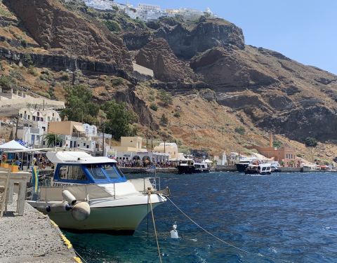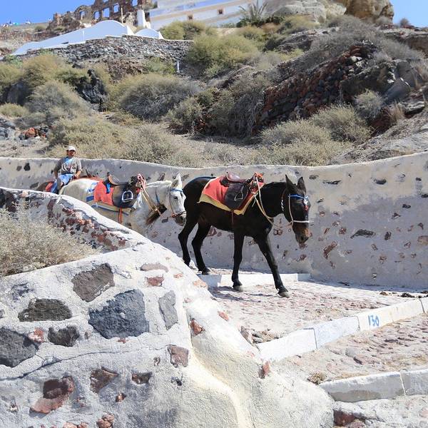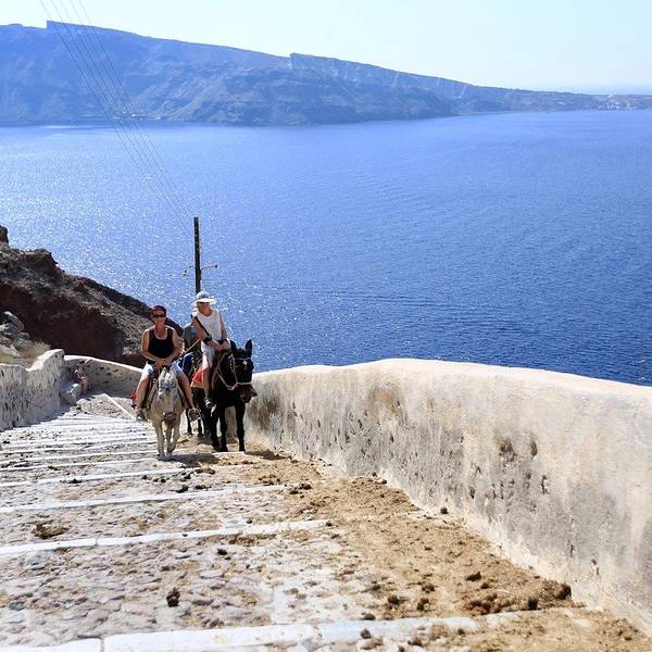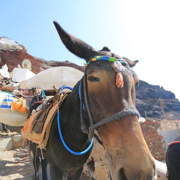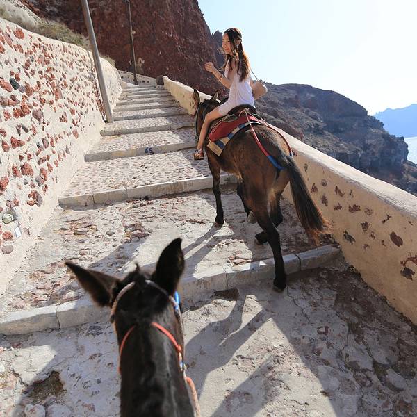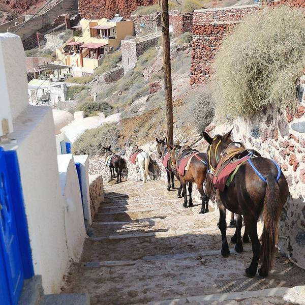 如果开车的话可以从镇后的车行线开到,名字叫做阿莫迪港口。终于快走到山脚下了…路边开始出现各种排着队准备接客的驴子,一水儿的驴屁股~~这些驴子不仅能驼重物,还是很聪明的,懂得自觉站队归位,特别有意思~山脚下的小港口,少了悬崖上那些蓝白小房子的精致,却多了几分淳朴而清新的小渔村的味道。