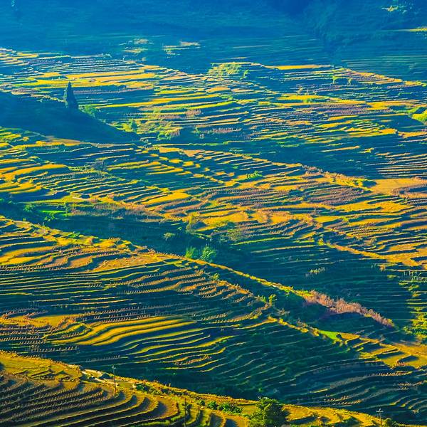 这里日落太美了,一大片梯田随着光线不同颜色各一,非常振憾。
