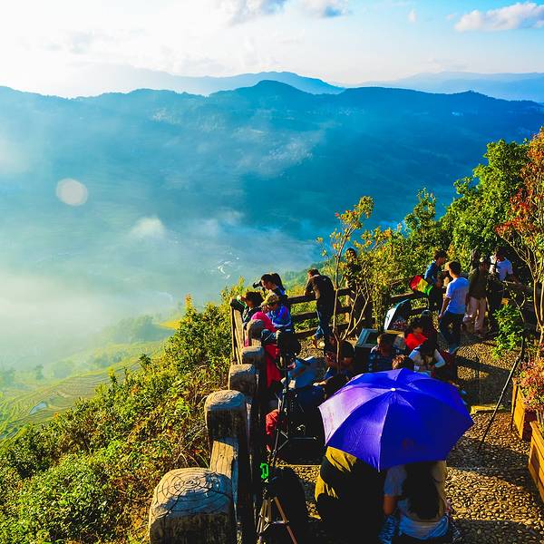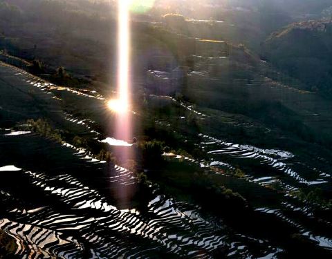 这里1—2月景色最美,春节前后经常有云海出现。每当下午四时后,白茫茫的坡海随着夕阳西下,逐渐变成粉红色、红色。再转变成粉红色、白色。这里是观赏和拍摄梯田随时光变化而变化的好地方。