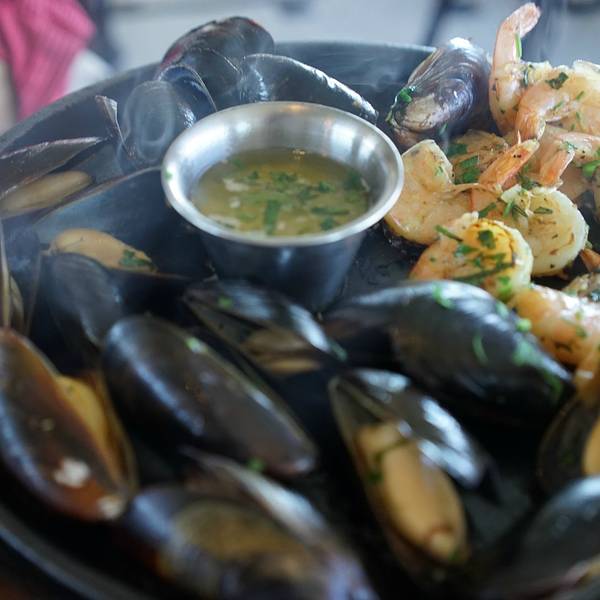 到了吃螃蟹的地方,其实Pier 39一条街全是吃螃蟹的,要早点去哦,我们到的时候7点了,全线开始排队了。但是我俩今天人品爆棚,正好有个两人位的,没有等就在众人羡慕的眼光中,施施然上座了。菜单挺丰富的,可以单点一只螃蟹,或者像这样,点一些 combo套餐。咱们点的就是贻贝,虾和螃蟹的套餐,吃下来,还是螃蟹最不好吃。也不能说不好吃,就是烹饪方式不太适合我们中国胃,肉质没有大闸蟹好吃(原谅我作为一个江浙姑娘,什么蟹都要拿来跟大闸蟹比上一比)。虾跟贻贝敲好吃,方先生本来不太爱吃贝类的,嫌麻烦,经此一役,彻底爱上贻贝了,真的非常新鲜非常嫩。两个人吃这么一份也就饱了,不饱可以再加一些面包。