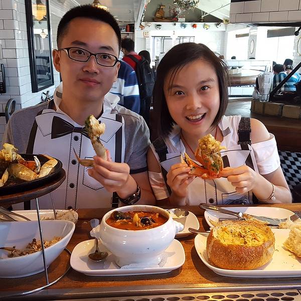 到了吃螃蟹的地方,其实Pier 39一条街全是吃螃蟹的,要早点去哦,我们到的时候7点了,全线开始排队了。但是我俩今天人品爆棚,正好有个两人位的,没有等就在众人羡慕的眼光中,施施然上座了。菜单挺丰富的,可以...到了吃螃蟹的地方,其实Pier 39一条街全是吃螃蟹的,要早点去哦,我们到的时候7点了,全线开始排队了。但是我俩今天人品爆棚,正好有个两人位的,没有等就在众人羡慕的眼光中,施施然上座了。菜单挺丰富的,可以单点一只螃蟹,或者像这样,点一些 combo套餐。咱们点的就是贻贝,虾和螃蟹的套餐,吃下来,还是螃蟹最不好吃。也不能说不好吃,就是烹饪方式不太适合我们中国胃,肉质没有大闸蟹好吃(原谅我作为一个江浙姑娘,什么蟹都要拿来跟大闸蟹比上一比)。虾跟贻贝敲好吃,方先生本来不太爱吃贝类的,嫌麻烦,经此一役,彻底爱上贻贝了,真的非常新鲜非常嫩。两个人吃这么一份也就饱了,不饱可以再加一些面包。