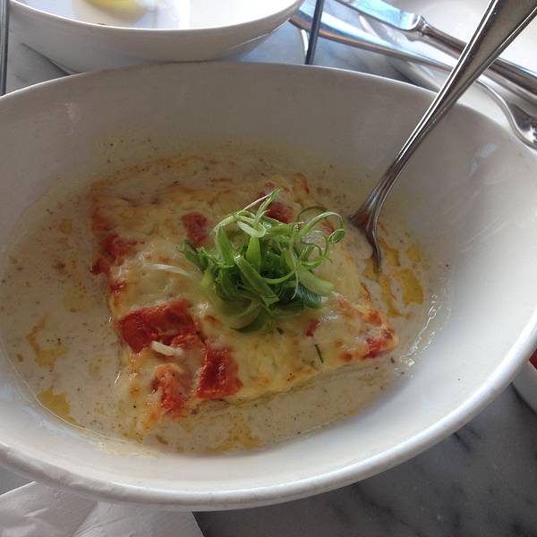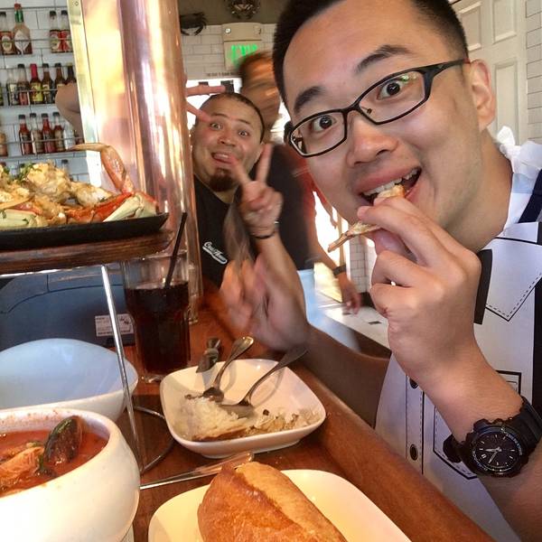 打车到渔人码头,走到游艇停靠的地方,就能看到crab house的蓝白标志在二楼,出发前就在网上预定的位置,我们到达后直接报预定号就行,可惜当时已经没有靠窗的位置了。这家非常热门,12点的时候门口已经排上长长的队伍。餐厅里到处装饰着大螃蟹,各种颜色。餐桌都不大,我们3个人坐的4人桌,点了一个全蟹、一份面包海鲜汤,一份青口拼大虾,加上餐馆送的面包就几乎摆满整个桌子了。大螃蟹是真的很大,比我的脸都大,上来是是完好的一只,然后服务员会上前询问是否需要切开,螃蟹是先煎一下,然后搭配餐厅调制的酱汁,味道我感觉有些偏淡。海鲜面包汤海鲜料很足,浓稠的很好喝,就是面包有些硬,不如我在关岛吃的面包汤的面包好吃,要快点喝不然一会汤汁就被面包吸光了。铁板青口和大虾挺好吃,虽然青口不如新西兰的大和鲜美,但也还爽口,酱汁有些些酸。老美的牙口实在好,送的面包那个厚实那个硬啊,吃下去抵得上一碗饭了。总共消费了94刀,算上小费,15%大约要110了,总体来说口味和服务都还比较适宜,不存在歧视中国人或怠慢的事情,但正餐时间还是要提前预定比较合适,可以上crab house的网站预定,在预定的时间内到达就可以,无需任何费用或抵押。