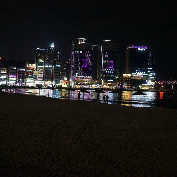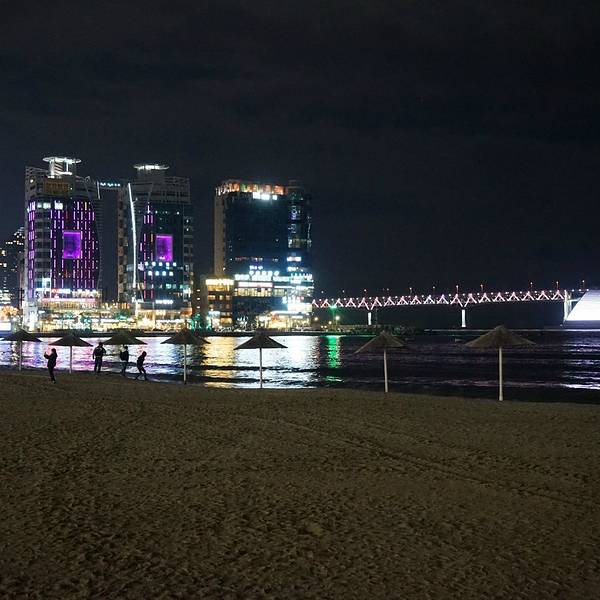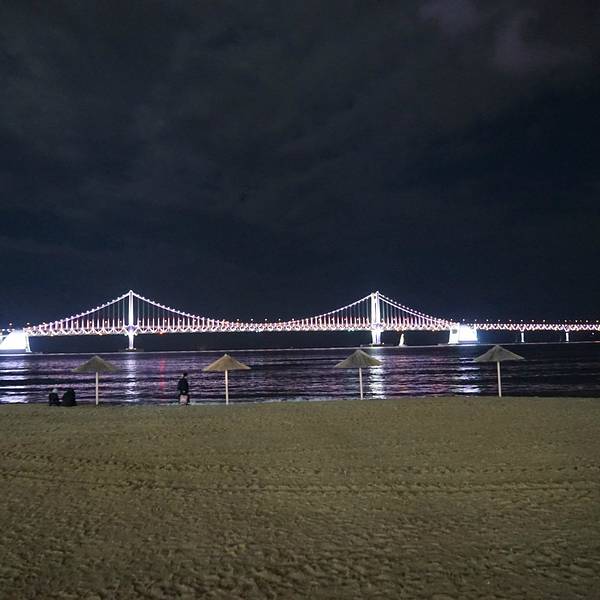 交通:地铁2号线到广安站下,步行10分钟左右,再往前便是广袤无垠的大海,这边便是广安里海洋浴场,一座大桥横跨在海上面,这里便是广安里大桥。看到攻略中很多人推荐来这边看夜景,便从海云台海水浴场直接搭乘地铁到了这边。感觉这边的生活气息会比海云台那边浓郁很多,周边也是多了很多高楼大厦。 赶到灯光亮起来之后才过来的这边,晚上华灯初上,很适合看夜景,而且这边的游人相比起海云台那边少很多,沙边沙子的质量也很细腻,并不比海云台逊色多少。过来的时候,这边只有寥寥星星几个人,感觉像是自己一人承包了这一片沙滩。周边还汇聚着一些美食餐厅以及咖啡馆,比较多的是炸鸡啤酒店,约三两好友,到这片海滩边,打包一份炸鸡,带一打啤酒,一边聊天一边看景,想想便是惬意的不行。