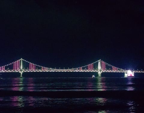 到了晚上8点,夜灯开放以后,桥身璀璨夺目,是看夜景的好地方。广安大桥是韩国最大的海上桥梁
