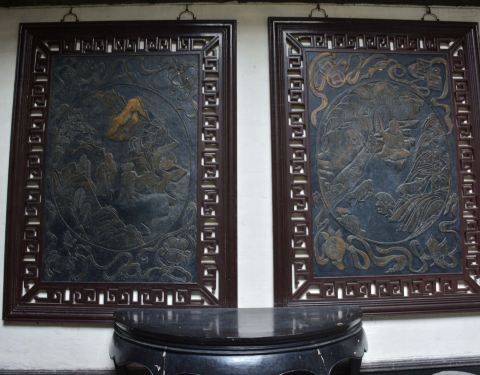 膺福堂的门楼亦是八字形,飞檐翘角,气势宏伟,显示了非同一般的官第型制。屋内木雕的莲花门,以及一些古家具,均玲珑剔透,可见当时屋主人的豪华气派。那孩子身旁是一顶官轿,放着“拍照一元”的纸。中堂画是九只鸟儿,题着“九*图”(中间那字认不出),两侧对联为“持身勿使白璧玷,立志直与青云齐”,再两侧柱联:“几百年人家无非积德,第一等好事只是读书”。都相当有教育意义呀。