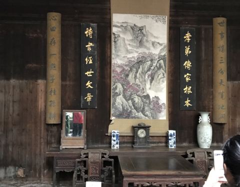 旷古斋是一座由庭院、花园和多单元房子组成的私家宅院。 从旷古斋门罩的造型就不难看出主人的身份旷古斋,徽州古民居的一大特色,就是建有门楼、门罩。它的作用既可以遮风避雨,保护门扇、门框,也可以显示出主人的身份、地位和理想追求。徽州人十分重视门楼的修建,有“千金门楼,四两屋”之说,古人宁可花去...旷古斋,徽州古民居的一大特色,就是建有门楼、门罩。它的作用既可以遮风避雨,保护门扇、门框,也可以显示出主人的身份、地位和理想追求。徽州人十分重视门楼的修建,有“千金门楼,四两屋”之说,古人宁可花去千两黄金用来修建门楼,仅仅花费四两用来建房子,听起来有些夸张,但可以反映出门楼是身份地位的象征。门楼上面雕刻有精美徽州三雕——木雕、砖雕、石雕,制作得富丽堂皇,展现了新安画派和徽州版画深厚的艺术根基,也展示了徽商在当时的中国无与伦比的财力和物力。 从旷古斋门罩的造型就不难看出主人的身份。整个门罩呈元宝形,两头翘角的下方各有“富”、“贵”二字,“富”字表达了主人希望经商赚钱,招财进宝的追求,“贵"字则是反映了主人亦商亦读,以商保仕的愿望。 旷古斋是一座由庭院、花园和多单元房子组成的私家宅院。前面对游客展出的是前楼厅堂。厅堂的陈设是典型的古徽州风格,正面板墙上方悬挂的是一块隶书宇大匾“旷古斋”,匾额下是中堂画,画两边有两副古对联,其中一副是“孝悌传家根本,诗书经世文章”,这是一幅改字联,其中把“孝悌”写为“孝弟”,更扩展了兄弟和睦之情;“文章”的章字中“早”字竖出了头,以示多读诗书早日出人头地之意。 展开