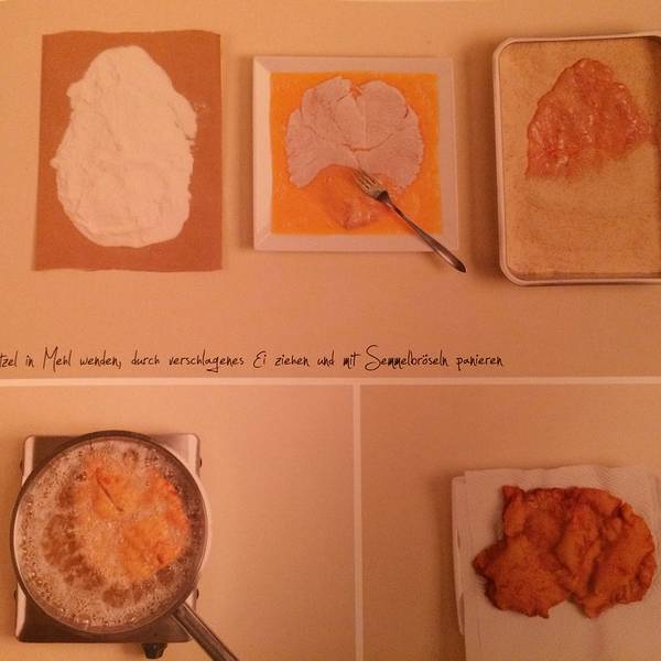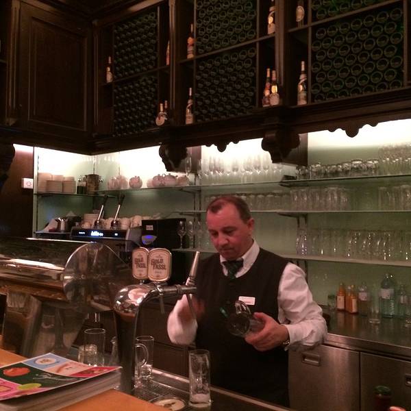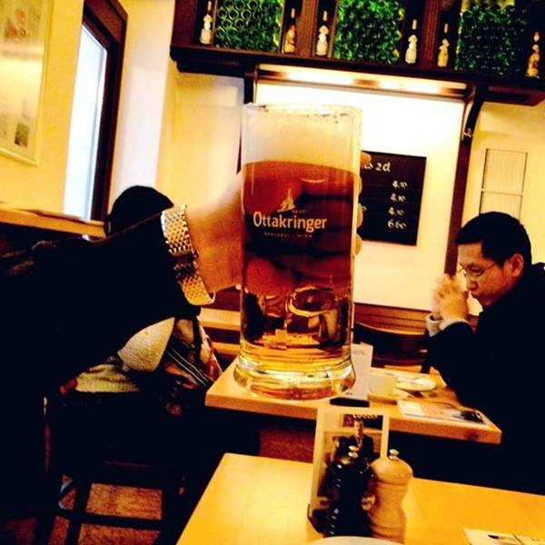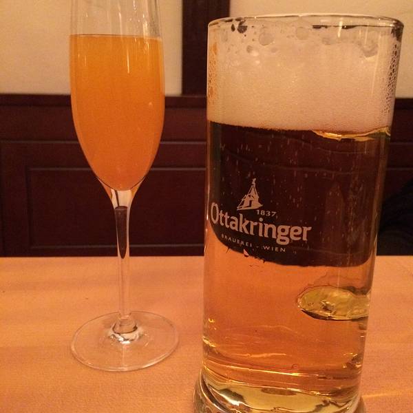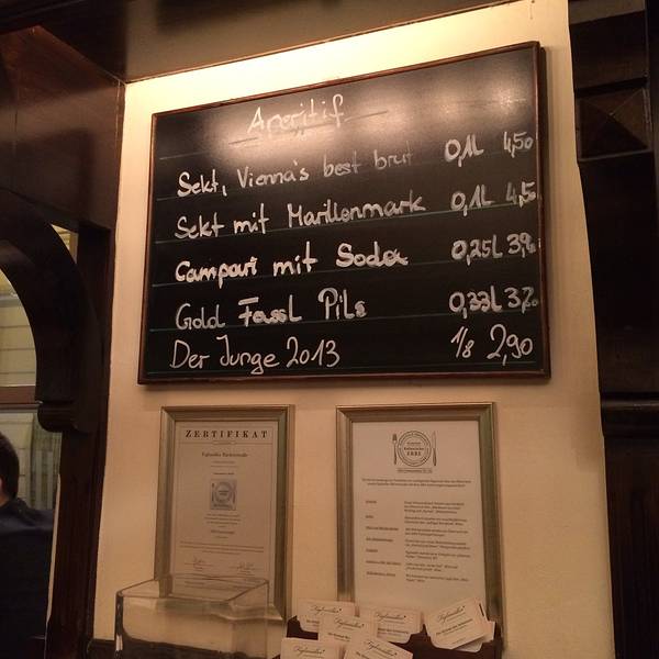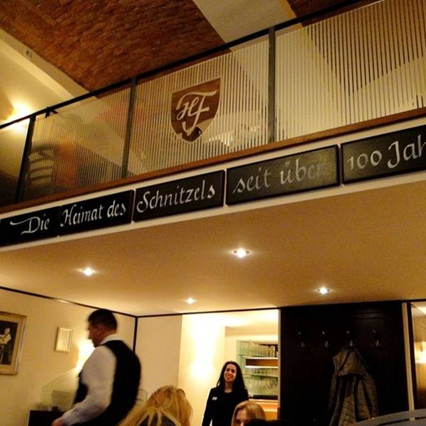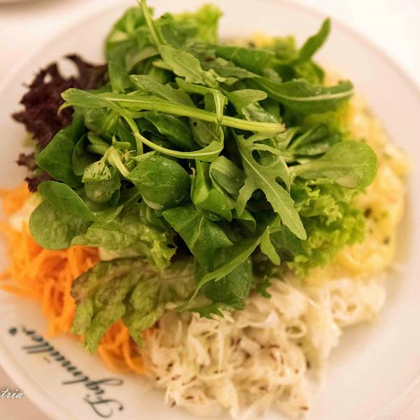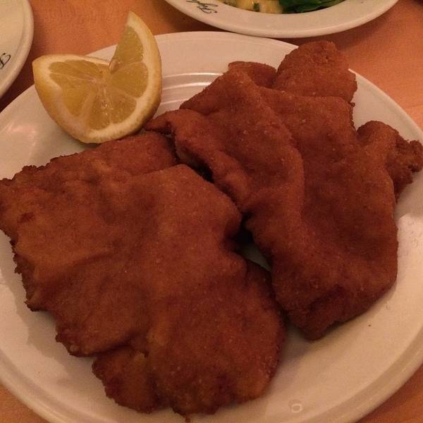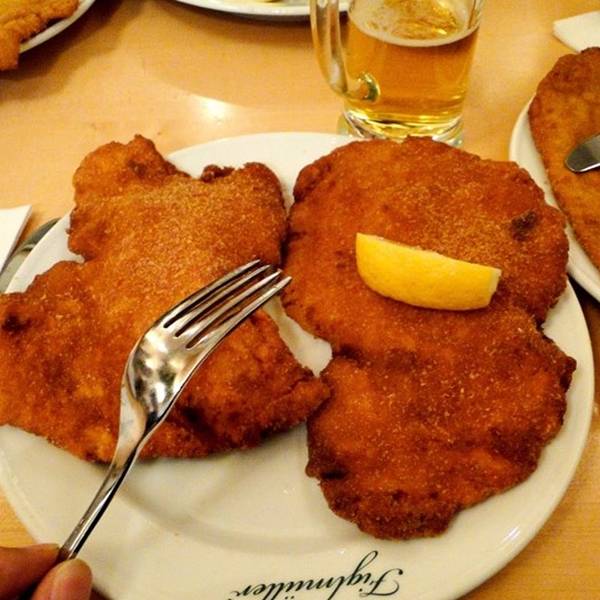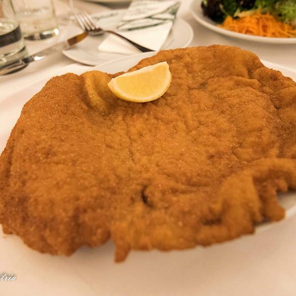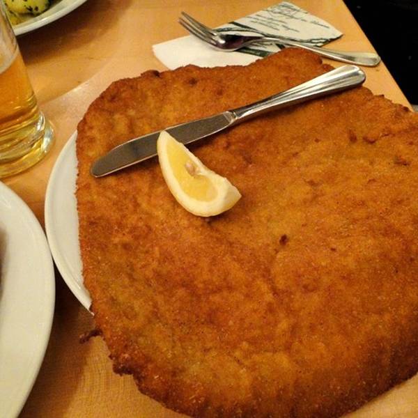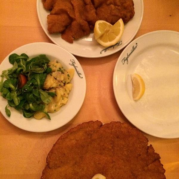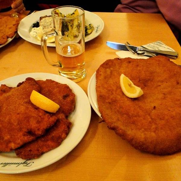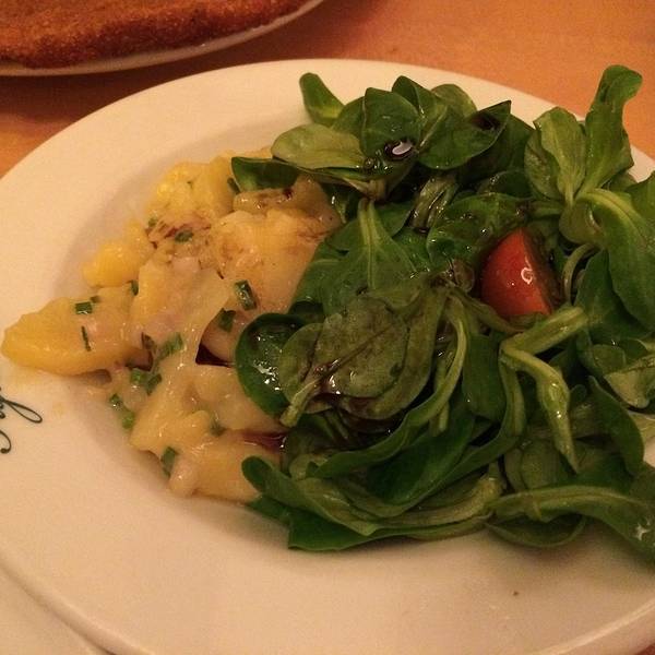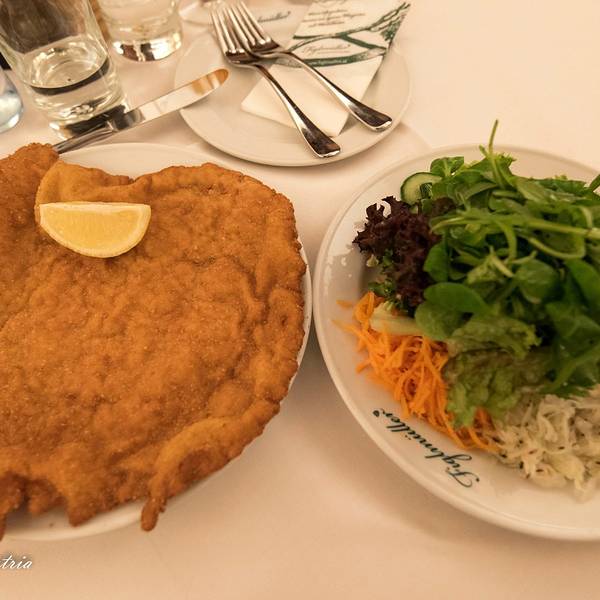 于是人们纷纷转到了新店,那里没有预定排队就好了,我已经筋疲力尽,恨不得在路边坐下,又累又困已经有些神志不清。排了40分钟,点好后等餐又等了30分钟,这边上菜不像咱们一样一个一个上,是你点完后一直等着,会将你点的一起上来。终于终于在北京时间凌晨4点,当地时间22点吃上了炸肉排,因为有人说炸肉排正宗的应该是牛肉,也有人说是猪肉,我们各点了一份,确实很大比脸都大,沙拉非常好吃,炸猪排很好吃不过有点没味儿,想念上海的辣酱油,要了番茄酱,给拿来一点点,结账的时候发现这点儿收了0.5欧,炸牛排还是第二天酒店对面PlachuttaGasthaus zur Oper餐厅的好吃,那家更嫩。