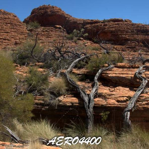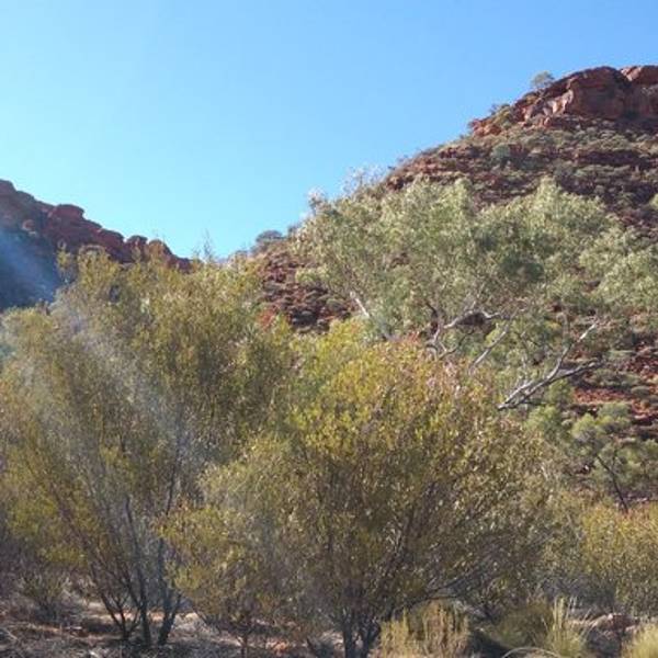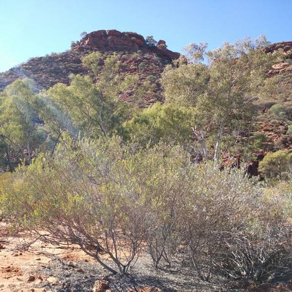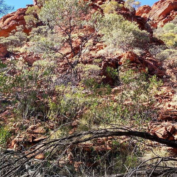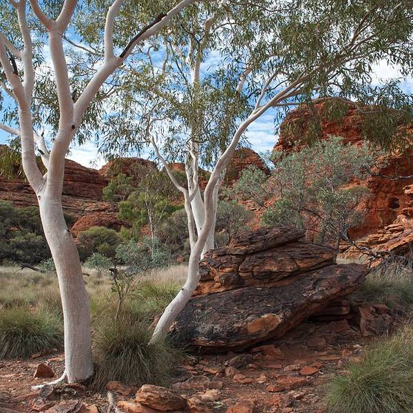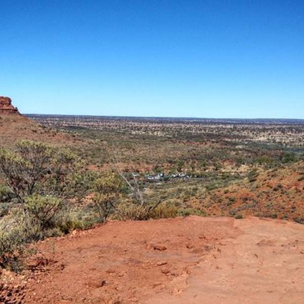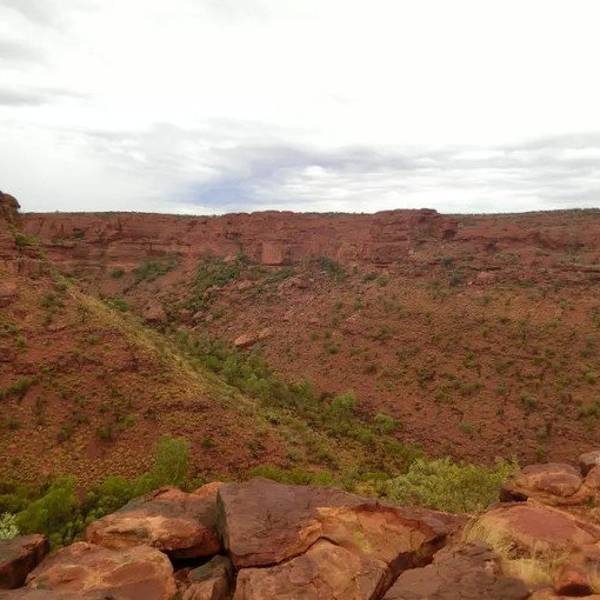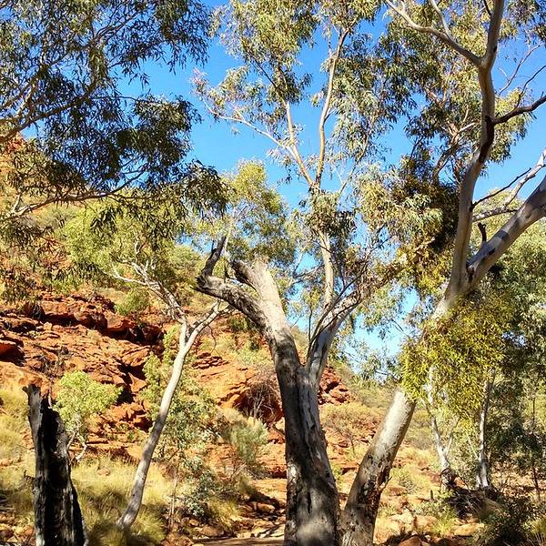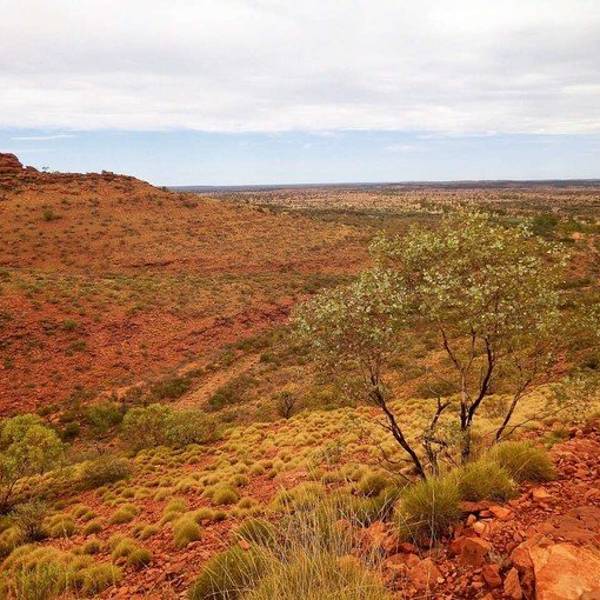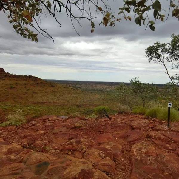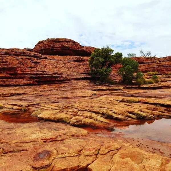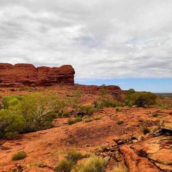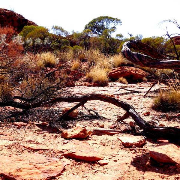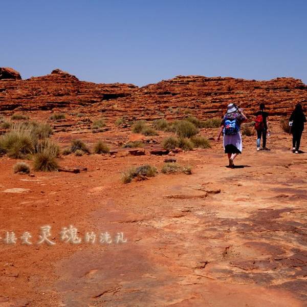 再没有比澳洲中部的地形地貌更适合拍恐龙照的了!非常喜欢这种白皮桉树和红色的岩石配在一起的感觉虽然头一晚下了雨,第二天却天气非常好,无风也不太热,国王谷有好几条徒步线路,比较简单的有半小时的,我们选了从峡谷顶上走的三小时的rim walk。
