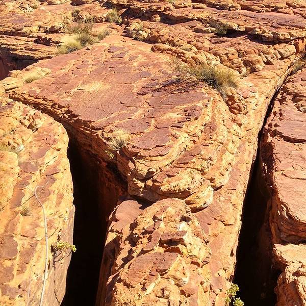 海水枯竭成石,岩石雾化随风,历经了上亿年,你的爱情还如新吗?峡谷中有层次丰富的岩页,可以清楚地看见水流冲刷出的痕迹。也不知道是因为向导将这条著名的徒步路线渲染得太艰苦,还是因为昨晚的大浴缸让每个人都满血复活充满了战斗力,总之号称全程要走3个多小时的山路,在不到一个小时的时间里我们已经站在了国王峡谷的山巅上。再次想起《在世界中心呼唤爱》的场景,男主角就是站在这里——国王峡谷的群山之巅,将离世前女友的骨灰洒落。所谓海枯或者石烂,那总是亿万年才会发生的事情,人生短短数十年,根本无法比拟。PARK说,因为这里的山体岩石都被海水浸泡过,所以相对比较脆,经常有山体边缘的石块整块断裂掉落的事件发生。甚至发生过有游客在此照相然后秒变自由落体的惨剧。