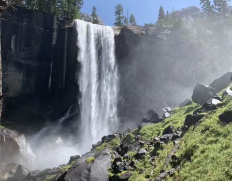 这个瀑布在优胜美地国家公园的若干瀑布中不算高的,但它的水量很大,站在瀑布下面,感觉周边就像在下雨一样,一会儿衣服就湿了。据说有太阳的天气,这里时常有彩虹,但我去时没有太阳是阴天,没有看到彩虹,不过瀑布本身已经美得不行了。