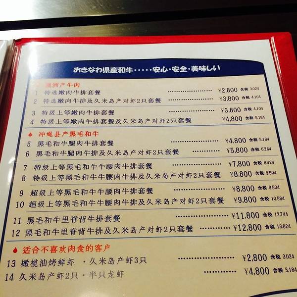 烧肉国际 IN NAHA在冲绳当地是很有名气的烤肉店,其中一个原因就是提供冲绳出产的闻名全国的石垣牛肉和阿古猪(黑毛猪),价格适中,更重要的是店内有中文服务,也有中文和配图的餐单。店内有不同的套餐可供客人选择,价格也因应牛肉的肉质等级而有所不同,因此客人可以根据人数以及预算权衡。石垣牛肉的肉质跟神户牛等不同,可以细细品味,店内也有冲绳本土产的和牛提供。