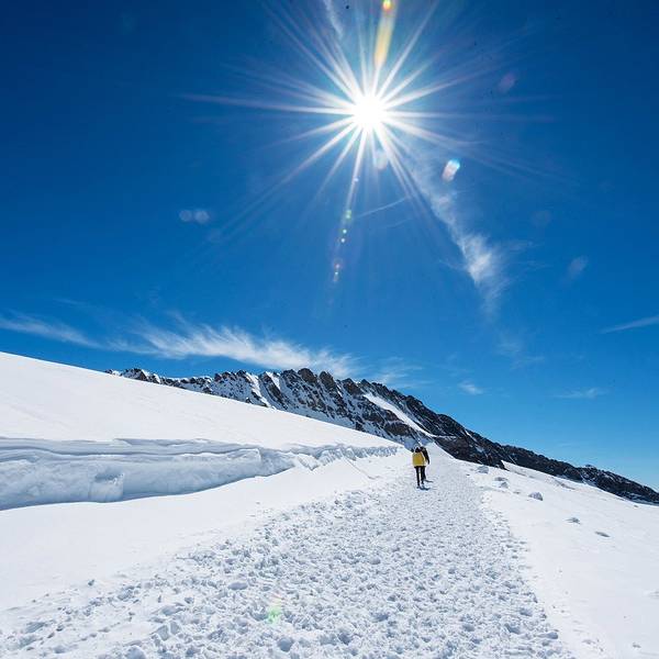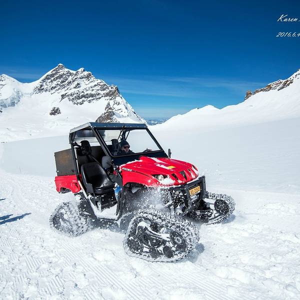 从气象站观景台坐电梯下来,当走出这个建筑的时候,冰冷但又纯净的空气涌入体内,用沁人心脾这个词来形容是最恰当不过的了。顺着雪车压出来的徒步道往前走,脚下咯吱咯吱的雪声是那么的诱人!按照官网上的介绍,这条线路大约往返需要1个小时。本来以为难度是小意思,结果走两步滑一步的这种速度实在没考虑到,真心费体力。以至于我们单程用时就已经超过1个小时了,官网介绍简直就是个骗子!虽然海拔不算太高,但是在雪地徒步耗氧量太大,刚走到一多半的时候我就开始轻微头晕。所以以后一定要根据自己的体能来设计行程,不能一味的相信官网上的时间。另一点值得注意的是,雪山海拔高,防晒很重要。这一次轻敌了,结果化了妆的脸没晒爆,但耳朵和头皮却完全晒伤,第二天我的耳朵整个都是肿的。所以必须防晒!而且为了避免雪盲症,也一定要带墨镜。一路走一路歇,终于蹭到了线路终点的半山腰小餐厅。我由于轻度高反,实在不想往上爬,而老公这会儿体力还好,于是爬上了最高点。不过体验结果是:视角并没有多大区别,可上可不上。我俩瘫坐在哪里,看着远方的雪山、冰河、蓝天,感觉时间就这样静止了。这么美的地方怎么能不“每地一蹦”,高反也挡不住我俩那颗嘚瑟的心。当时刚蹦了两下就开始心跳加速了,“蹦蹦更健康”这句话在这里并不适用。