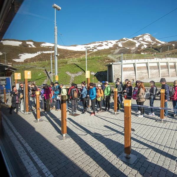 从山坳中的小镇乘坐火车慢慢往山尖爬行,窗外的景色从一片绿油油慢慢变成了白雪皑皑,列车在从山坳中的小镇乘坐火车慢慢往山尖爬行,窗外的景色从一片绿油油慢慢变成了白雪皑皑,列车在Kleine Scheidegg会换乘少女峰特有的红色齿轮火车继续驶向高海拔的少女峰。之前来到这里的时候,游客还很少,上了红色小火车可以根据不同的风景尽情的在车厢里换着座位;而如今,居然要开始排队上车了,还分为了团队入口和散客入口,而且上了车之后每个位子一个人,全是满满当当的,想换都难,而且居然一趟火车已经坐不下了,没能排上这趟火车就只能在这个中转站排队等待下一辆,每辆列车的发车间隔是半个小时,这对于时间就是金钱的旅游者来说,真的是种噩耗。据后来我们最后的一天的包车导游讲,如今的少女峰已经是异常火爆,每年从5点开始,少女峰就开始出现的排队现象,尤其在7、8月这两个月,更是会出现由于团队太多而不接受散客游览的现象。所以还是错峰出行最好,如果只能暑假前往,就只能碰运气了,除了要看天气的好坏,还要看当天对不对。