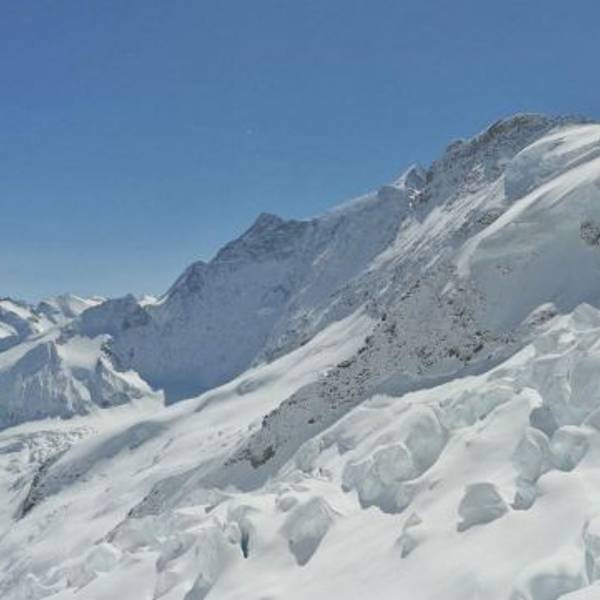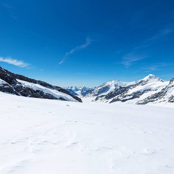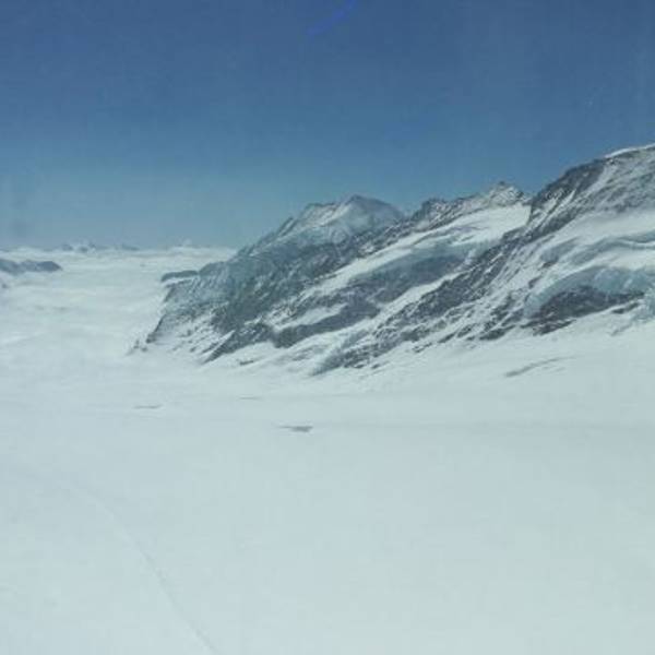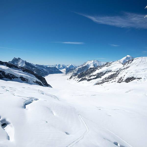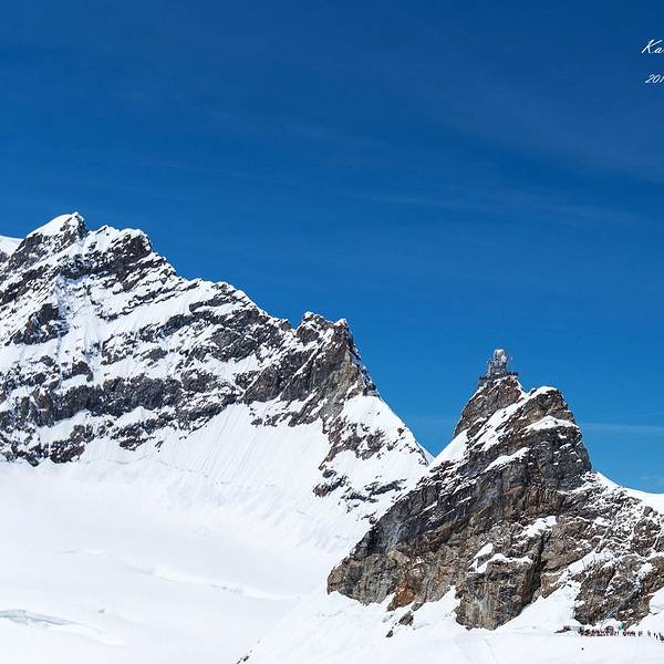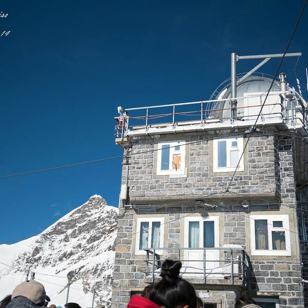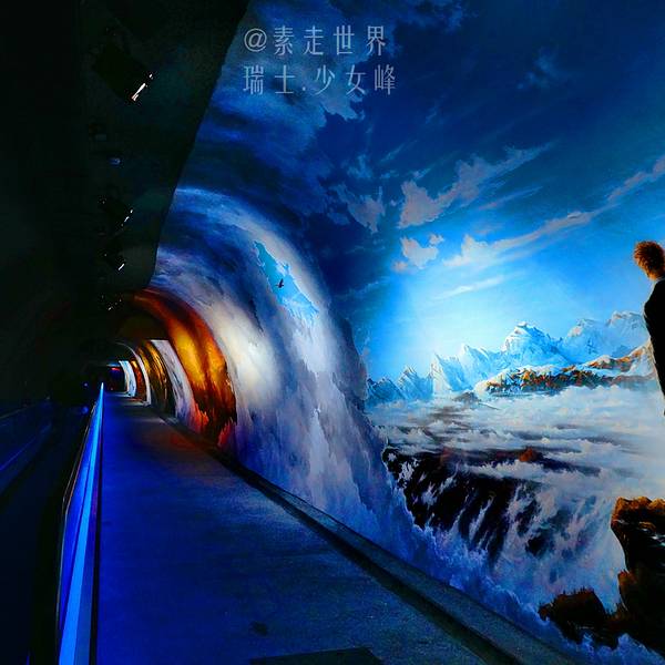 在Kleine Scheidegg→Jungfraujoch段,火车是在少女峰岩石中开凿的隧道中穿行的。行驶过程中,火车会在Eigerwang和Eismeer两个观景点各停大概5分钟,可以下车,近距离观赏壮观的冰川。而列车里的液晶显示屏会根据列车所在的地理位置进行全方位介绍,上一次没有注意这个宣传片,这次全程看了一遍,拍的还是很震撼的。火车终点站并不在少女峰山尖,而是在少女峰和僧侣峰之间的山坳处。下了火车直奔高速电梯,直接升到气象站观景台,被眼前的美景所惊呆了!天是那么的蓝,雪是那么的洁白,完全是仙境!看着眼前这纯净的画面,感觉自己的心灵也得到了一次净化。在这个观景台上,我俩360度全方位的 拍着各个角度的照片,想将这里的美好永远的记录下来,生怕遗漏掉每一处美景。远处阿莱奇冰河从两山之间一直延伸的脚下,本来计划找个向导在阿莱奇冰河上徒步,但是时间有限,而且对自己体力也不自信,还是在少女峰山脊上的冰原徒步吧。