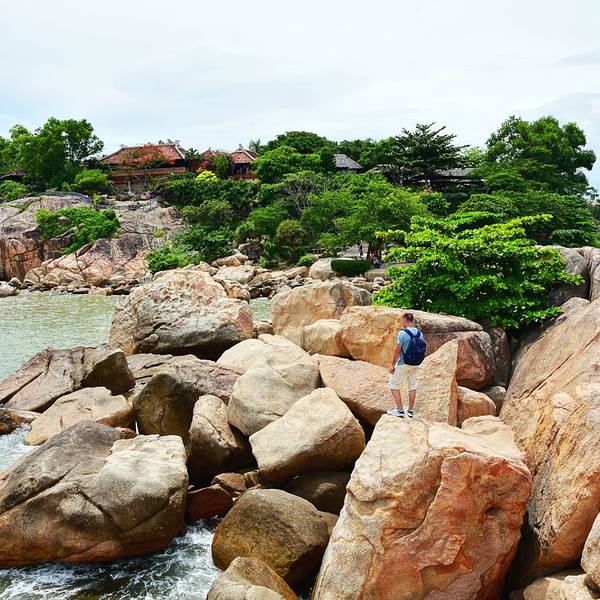 金骆驼 从售票处穿过表演堂后便能到达最佳观景点。我们尽管到的很早,但是一直到了临近黄昏才开始闲逛钟屿石岬角也叫五指岩,是法国电影《情人》外景拍摄地之一,临近尾声时,男女主角站在海边的礁石旁,做最后的道别。我们尽管到的很早,但是一直到了临近黄昏才开始闲逛。回国后不停的赞叹这个地方的美丽,但也会...钟屿石岬角也叫五指岩,是法国电影《情人》外景拍摄地之一,临近尾声时,男女主角站在海边的礁石旁,做最后的道别。我们尽管到的很早,但是一直到了临近黄昏才开始闲逛。回国后不停的赞叹这个地方的美丽,但也会有人问“你真的觉得自己这块破石头真的好看么?”近看,真的只是一块普通的石头,也只因拍了个著名电影而产生的故事。钟屿石岬的美在于远距离欣赏的美。从售票处穿过表演堂后便能到达最佳观景点。这个位置可以俯视整个石岬岛,当太阳变得柔和,树叶开始唱歌,花儿开始跳舞的时候就是这里最美的时候。从最佳拍摄地下去后可以到达岬岛,这边岬岛没有什么海滩,大多是花岗石堆砌而成,石头错落有致形成了它别致的风景,随便一个快门都能拍出美丽而浪漫的照片。如果你只想远远的看着,那可以到岛上唯一一家全景咖啡屋小憩,选择靠边的位置点一壶滴漏咖啡或一个椰子,配以一份甜点可以度过最悠闲的时光。临走前可以在大堂听一听越南传统乐器演奏曲,好些叫不上名的乐器,通过艺人的吹拉拍打组成了优美的乐章,让人流连忘返。英文名:Hon Chong Promontory