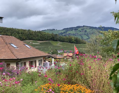推着行李过了一个又一个弯,结果在一个地方汽车道到头了。我又是一脸懵逼,这要怎么下去?于是之能原路返回看看是不是什么地方走错了,刚回头走了几步,路旁边的一户人家的门开了,一个阿姨走了出来,轻轻地问我想去哪里。我一开始还有点警觉(毕竟在意大利被坑了好几次),后来转念一下这是在瑞士,然后放心了下来。告诉她我想去到湖边拍照。于是她打开了自己院子的门,让我从院子里穿过去,并跟我说汽车只能到刚刚的地方,汽车要开下去得绕到另一头才行。